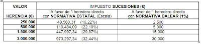 Así por ejemplo, en BALEARES, desde 2007, las donaciones a valor de familiares directos residentes tributan al 7%. Las herencias tributan al 1% aplicando la normativa balear si se cumplen simultáneamente dos condiciones: que la persona fallecida tenga su residencia fiscal en España y haya vivido más tiempo en Baleares durante los últimos 5 años, y que sus herederos sean residentes fiscales en España (aunque no sea en Baleares).